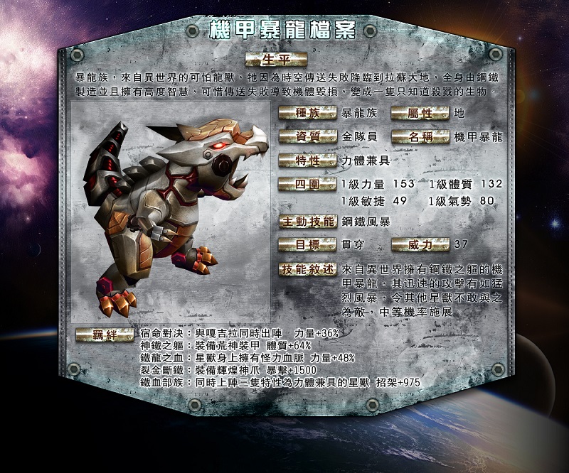 龍麻吉》,由於時空傳送失誤使牠降臨到拉蘇大地,機體毀損讓「機甲暴龍」變成一隻只知道殺戮的生物,但強大的鋼鐵身軀和戰鬥本能讓「機甲暴龍」成為最令人害怕的龍獸!其必殺技「鋼鐵風暴」迅速的攻擊有如猛烈風暴,能夠貫穿一切生物,如與狂暴星獸「嘎吉拉」共同出戰,可形成「宿命對決」羈絆!此外,「機甲暴龍」裝備「荒神裝甲」後可形成神鐵之軀,體質 +64%、裝備「輝煌神爪」後,暴擊 +1500 更有裂金斷鐵之能!即日起玩家於累計消費期間達到固定金額或加入討伐戰爭即可得到「機甲暴龍」獸魂,如玩家能夠蒐集散落各地的完整獸魂就能夠獲得最強鋼鐵龍「機甲暴龍」。