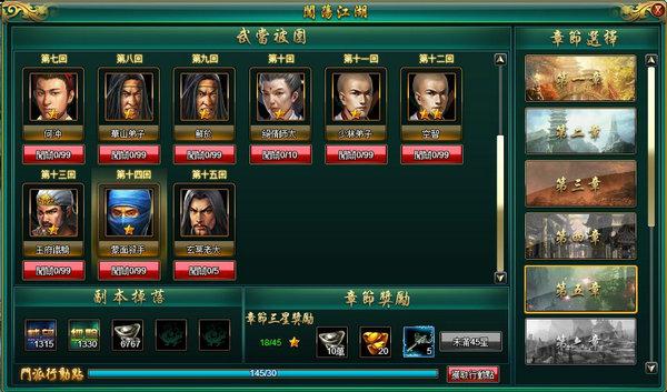 招募到弟子之後就是非常特別的闖蕩江湖,該部分總共分為 11 個章節,玩家需要逐一通關方可開啟下一關的內容。闖蕩江湖不只是單純的關卡挑戰,玩家若是順利通關,便可收獲元寶、門徒裝備等道具,以增強門徒實力唷!