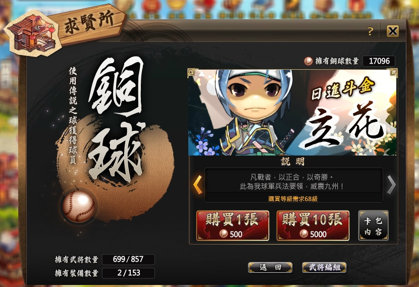 高等玩家還能選擇「智變千慮陸遜包」、「西涼驃騎馬超包」還有最新上架的「日進斗金立花包」、「兵強馬騰黑田包」,讓你拿到稀有武將機率大提升!