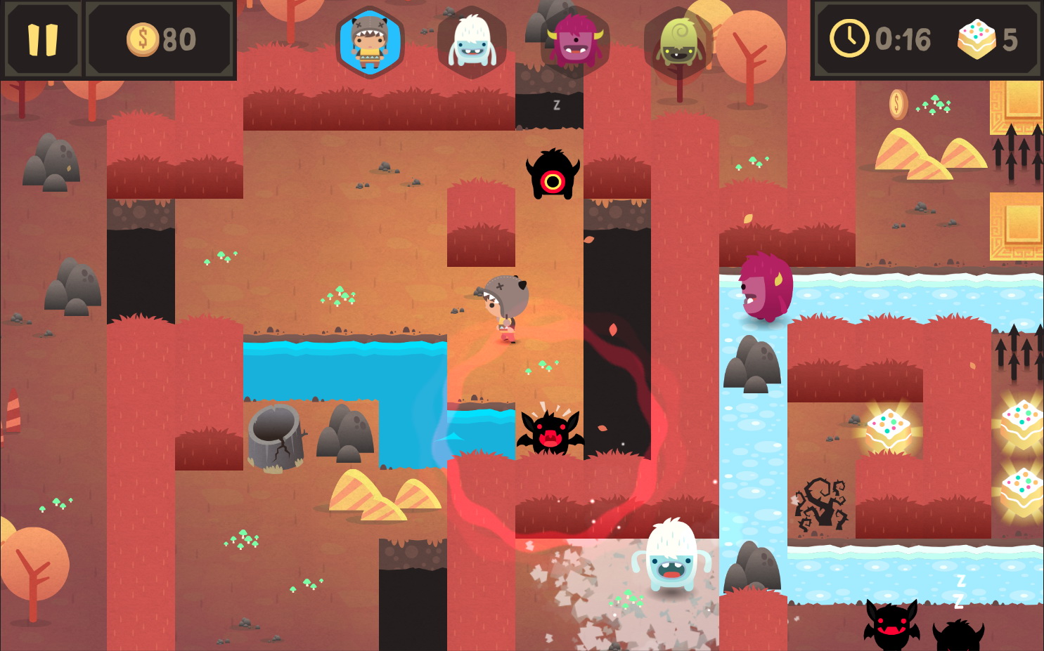 》這類遊戲般所得到的解謎與冒險體驗。透過以手指畫動的軌跡,玩家可以指派怪物至欲前往的路線,有時可能會觸發陷阱,有時則可以解開特定機關得到關卡中的隱藏寶物。