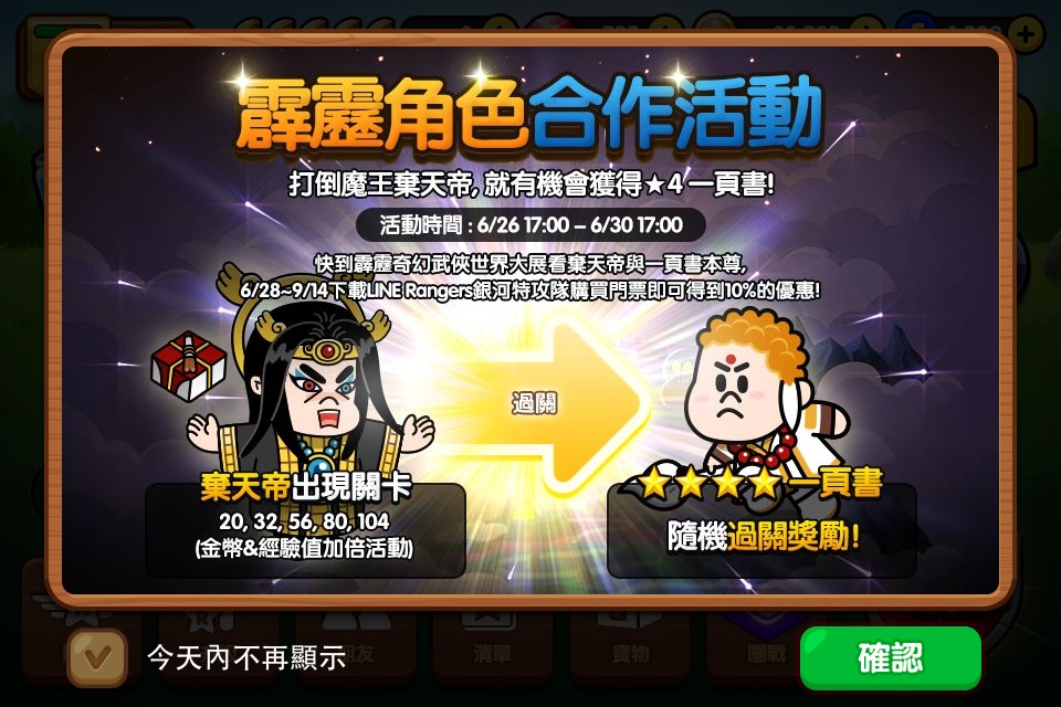 自即日起至6月30日(台灣時間17:00),在活動指定關卡20 、32、56、80、104關中,只要擊敗「棄天帝」,就有機會獲得隨機過關獎勵的四星角色「一頁書」,過關之金幣與經驗值也同時加倍。