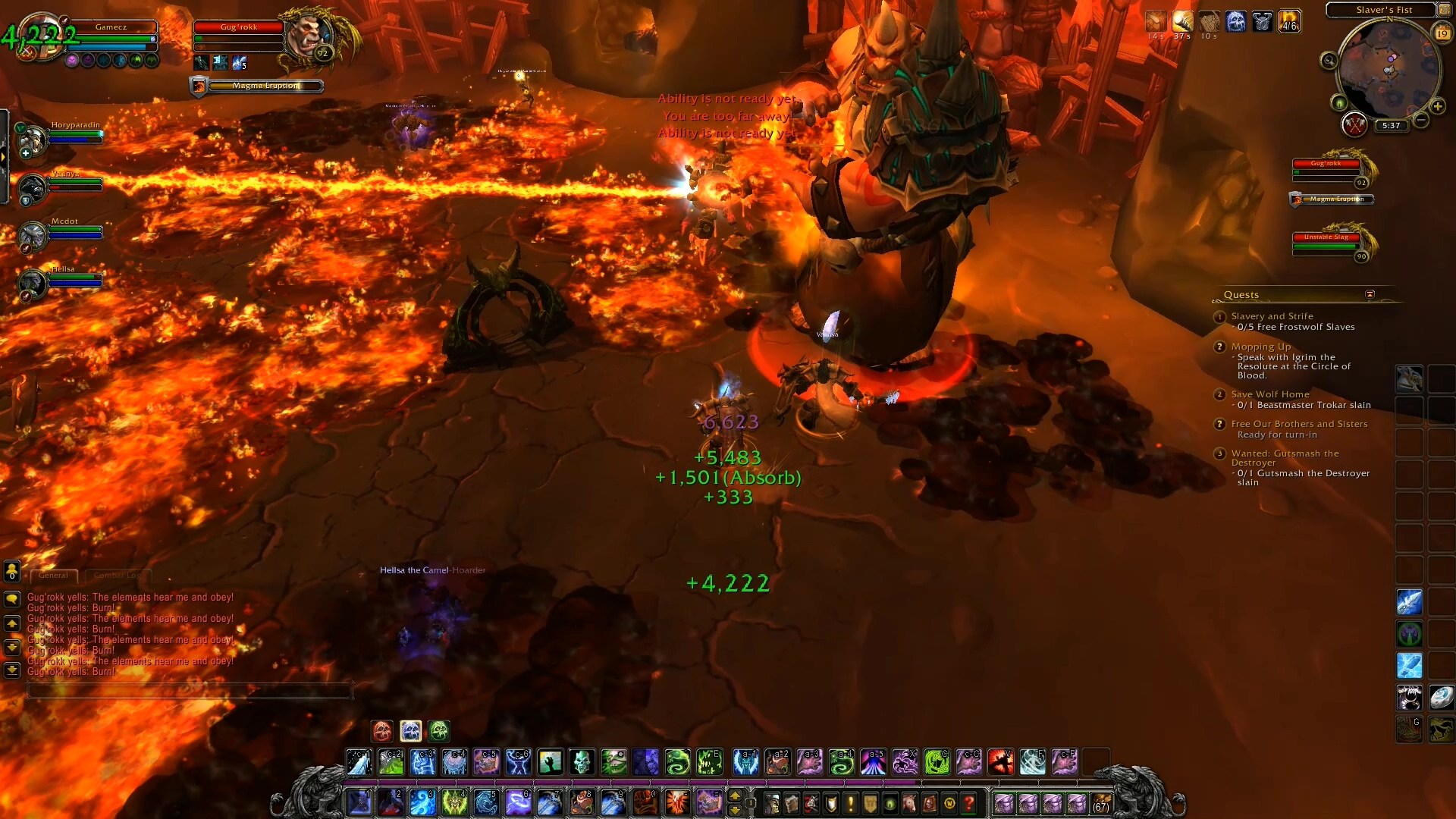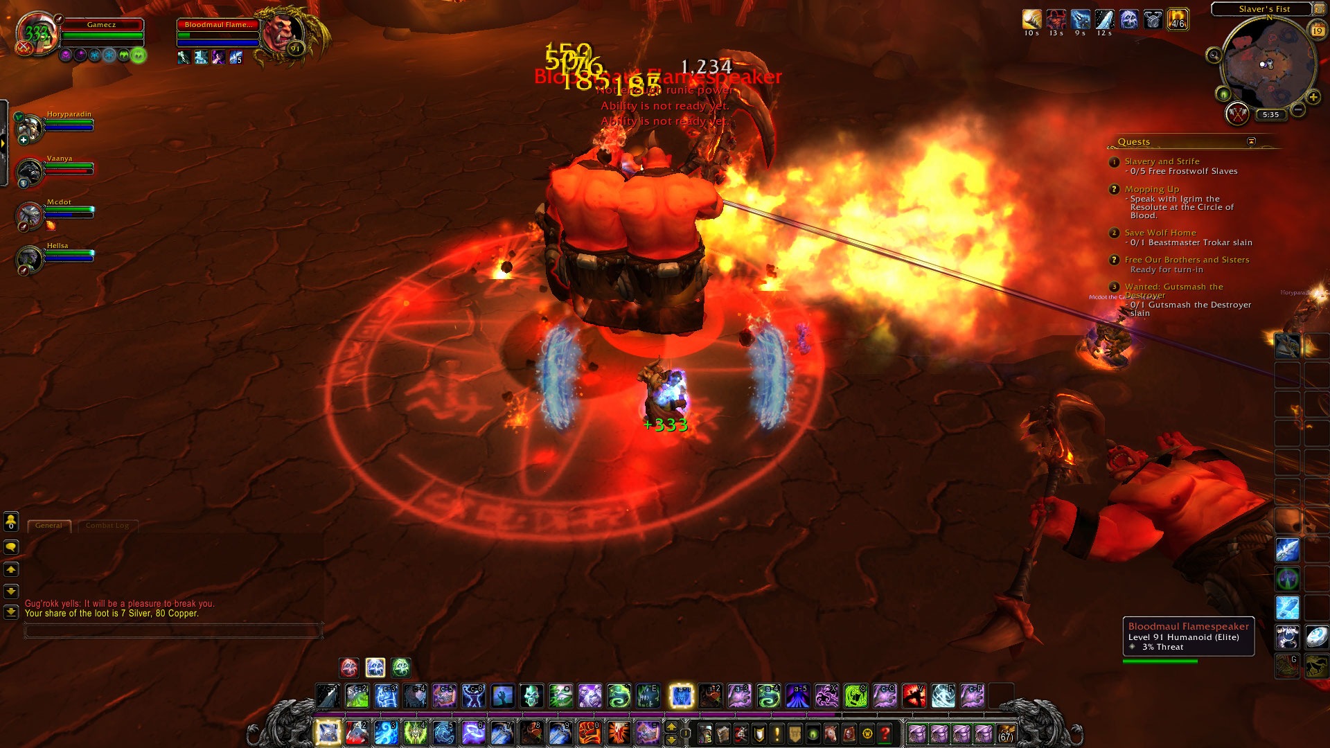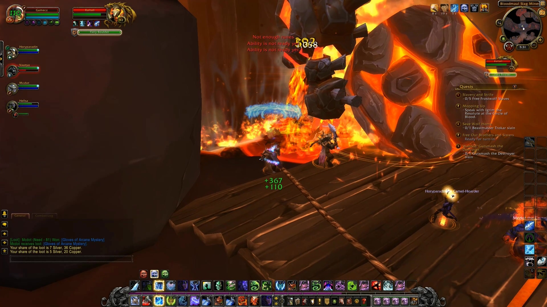 在霜火峰中玩家的第一個副本就是「Bloodmaul Slag Mines」,雖然副本位於冰雪覆蓋的霜火峰,不過內部卻是火紅炙熱的熔岩地形,在這邊將面對到巨魔及火元素等類型怪物的挑戰。