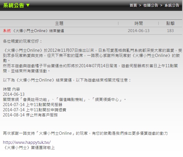 遊戲自 2012 年 11 月 7 日推出以來,受到許多玩家的支持,官方表示,於遊戲橘子平台聯運的合約將於 7 月 14 日期滿,屆時將同步關閉遊戲伺服器。以下為結束營運相關流程:
