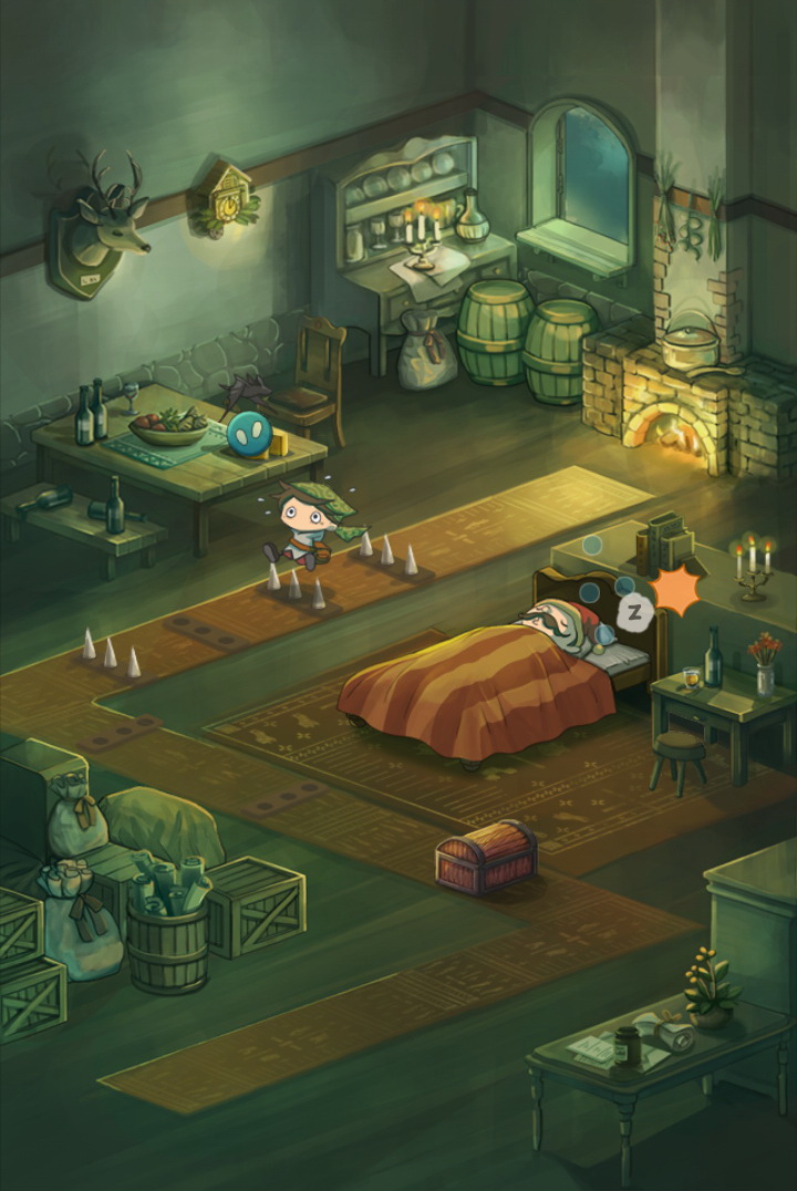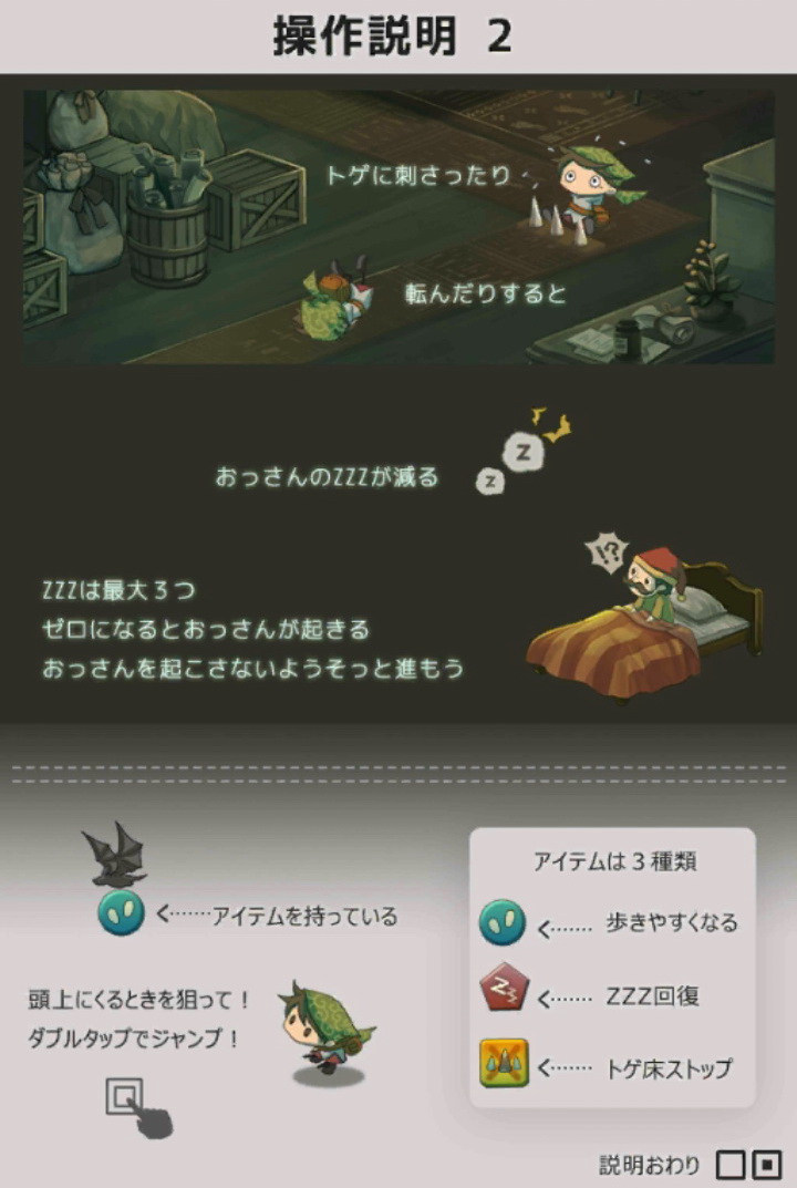 在本作中玩家要扮演小偷,趁大叔睡著的時候偷走寶物。而本作只有觸碰跟連續觸碰兩次的簡單操作方法,成為了一款無論誰都能夠遊玩的作品。