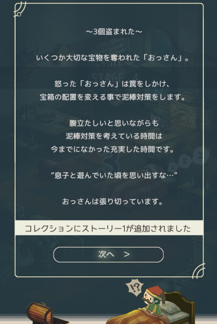 本作並不是單純偷東西就好,每通過一個關卡都會描述故事劇情。而在各關卡中取得寶物的時候,也會說明跟該寶物有關的背景故事。這些內容都是很溫馨的內容,玩家們肯定會被治癒的。