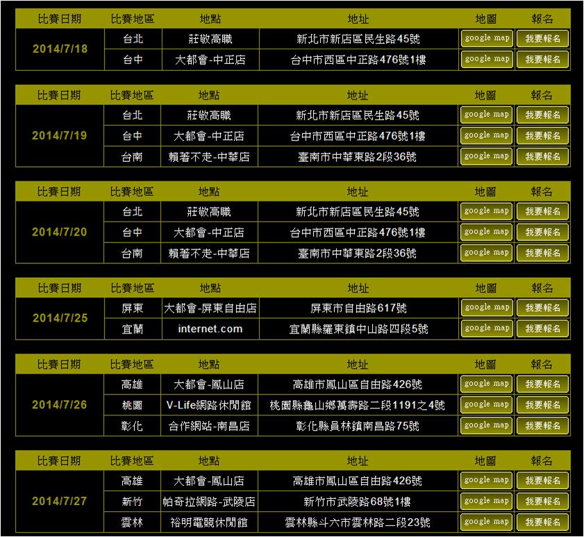 「2014 SF 夏季大賽」的決賽時間將於 8/9(六) 在台北花博公園爭艷館舉辦,全台預賽脫穎而出的隊伍將聚集在此一較高下。當天同時也是華義嘉年華活動現場,現場將有一系列精采的攤位活動以及豐富的獎品和虛寶,快參加比賽爭奪前往決賽的門票,並號召親朋好友一同參與盛會!