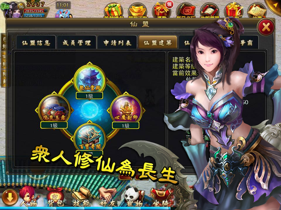 無論戰鬥力如何強大,孤軍作戰仍然無法所向披靡。只有在修仙界建立並且強大自己的仙盟,千萬仙俠一起聚戰天下,才能夠在仙俠世界裡稱霸。仙盟內各成員可通過結伴共同完成仙盟任務獲得靈石,繼而通過靈石升級聚仙靈殿、瓊漿玉露、心魔封印和百寶奇閣等建築來壯大所屬仙盟,從而提升自身戰鬥力。