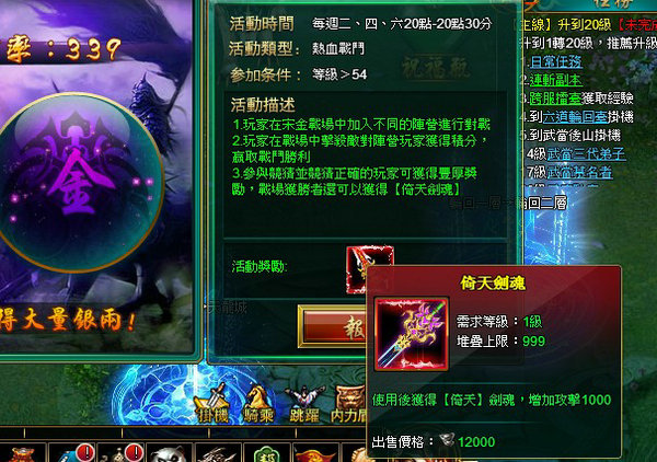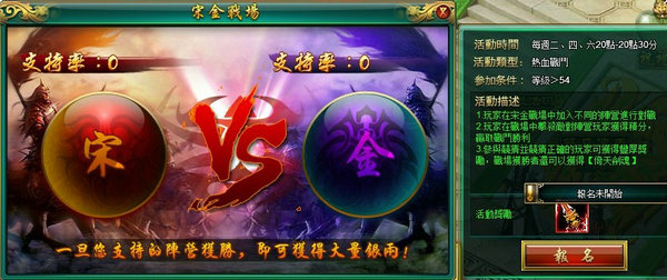 聲勢浩大的戰場就此拉開序幕,在這裡,每個人都將是驍勇善戰的英雄人物!而在戰鬥中獲得勝利的大俠不僅能贏得大量的經驗銀子獎勵,更有機會搶奪江湖人士夢寐以求的「倚天劍魂」!沒有來得及進入戰場為陣營戰鬥的大俠還可以如同支持世界盃般,在場外任選陣營助威,若該陣營獲勝,便可獲得對應的獎勵。