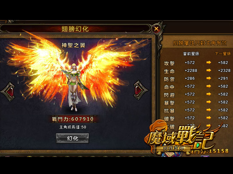 當培養翅膀星滿後點擊升級介面中的幻化按鈕便可進入幻化介面,在幻化介面中玩家可以看到不同戰鬥力和成長值之下的玩家穿戴有翅膀的樣子。而翅膀技能升級是增加玩家戰鬥屬性的另一種方式,技能越高載入在玩家身上的屬性越強戰鬥力也就越強!