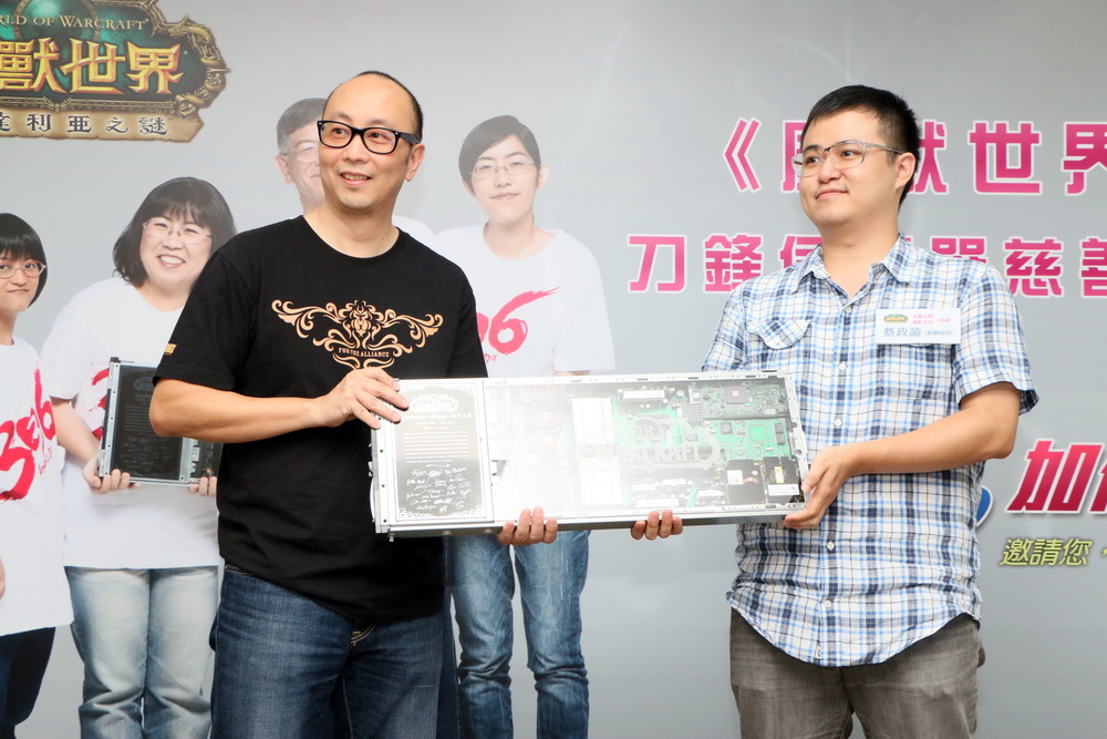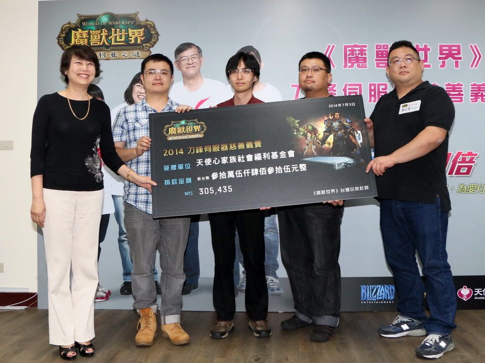 魔獸世界》玩家齊獻愛心,刀鋒伺服器慈善義賣與「有你愛加倍」公益勸募小額捐款金額共募集到 305,435 元,今日由四名刀鋒伺服器得標玩家蔡政諭、康傑、張國璽與趙之夏代表把善款全數捐給天使心家族社會福利基金會,將用以服務發展遲緩或身心障礙者之家庭。