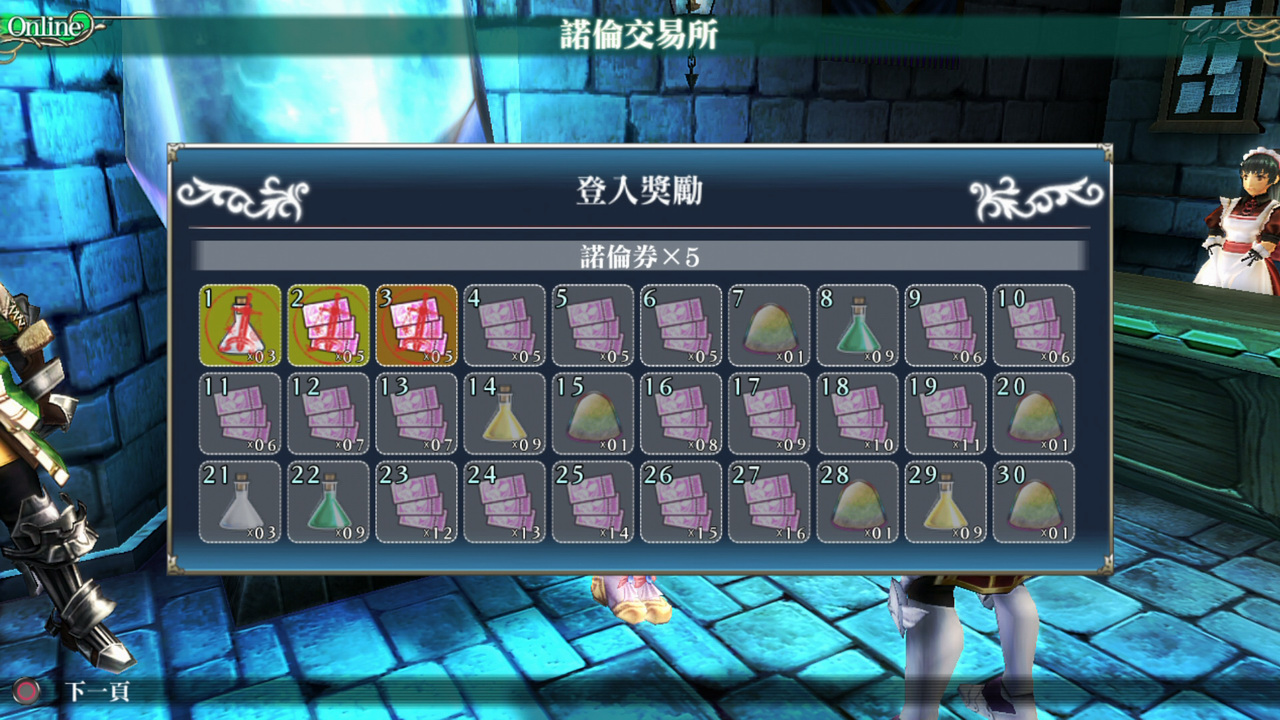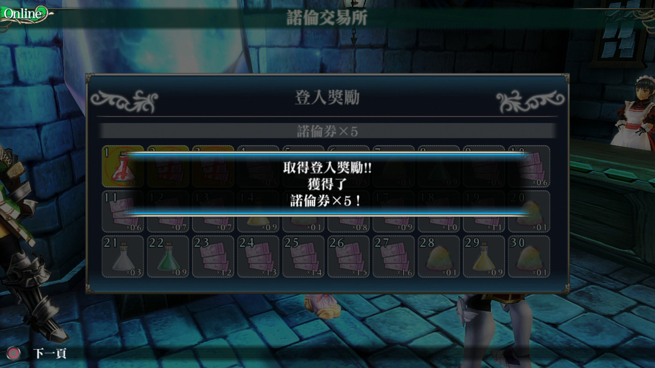 連線之後與諾倫交談(登入),1 天可以取得 1 次登入獎勵。每次登入均可在集點卡的格子上蓋章,蓋章之後即可獲得該格道具做為獎勵。