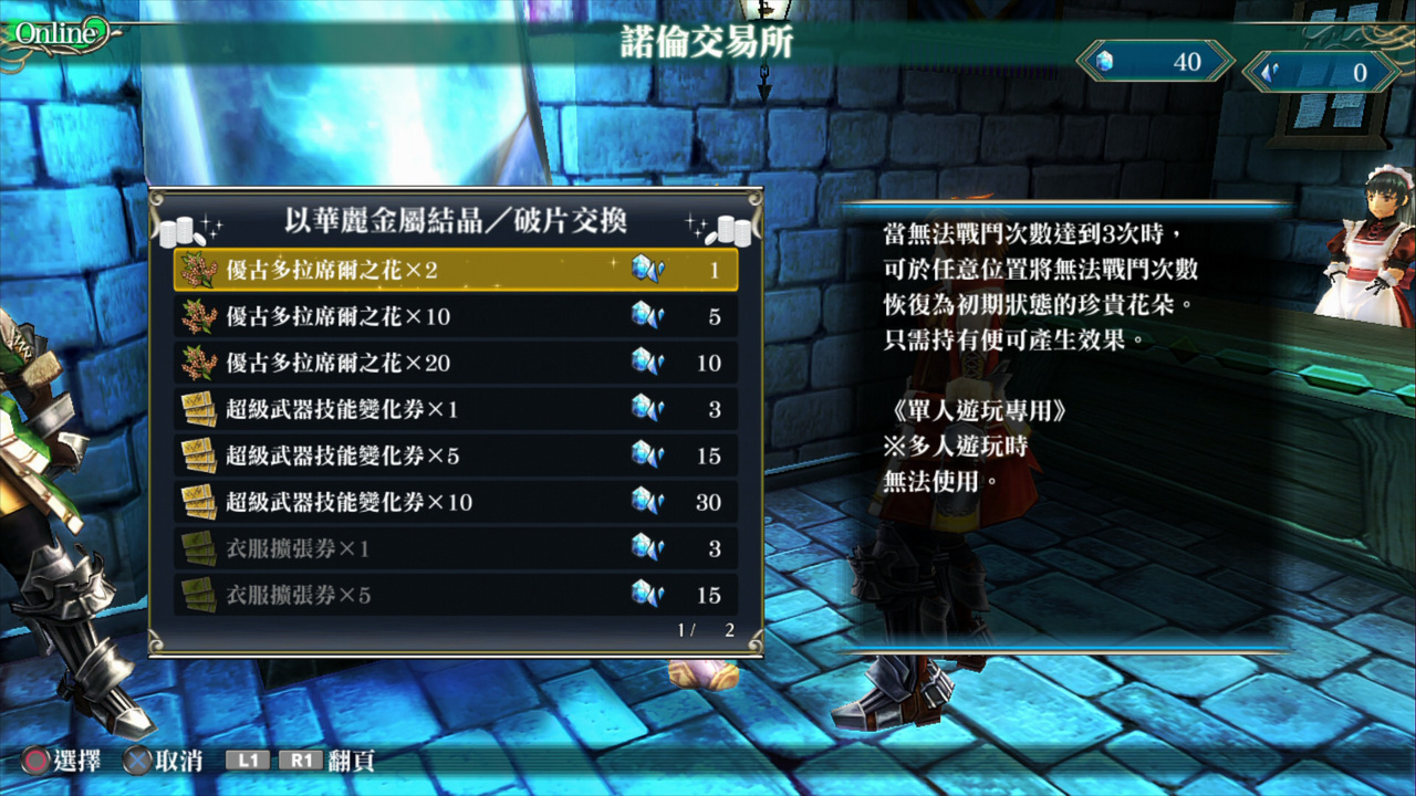 ※『華麗金屬破片』、『華麗金屬結晶』前者為免費道具,可於遊戲內透過『交付七色光沙』來換得。後者為必須在 PlayStation Store 內購買的付費道具。兩者在遊戲中有同等的價值。
