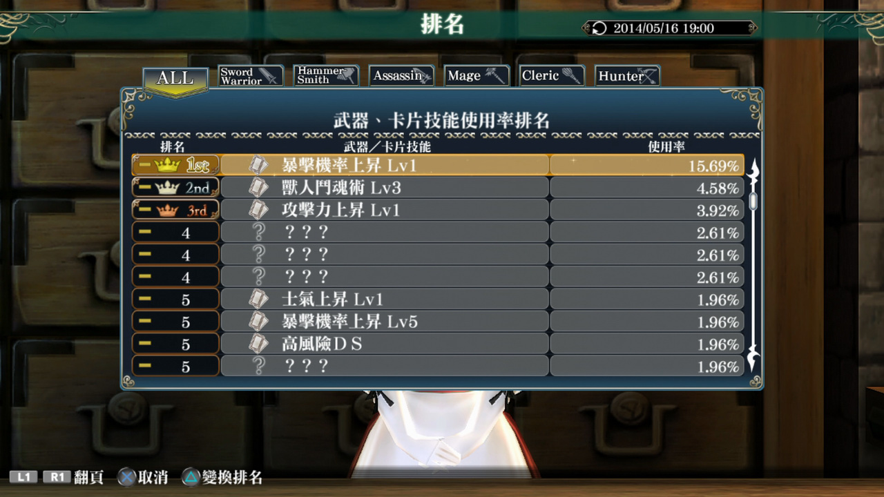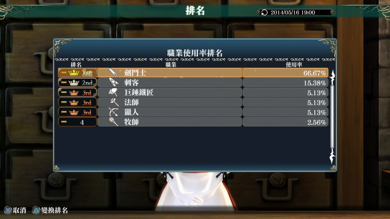 可觀看職業使用率、受歡迎任務、技能使用率、世界樹之塔完成時間等各種排名。不光是可享受排名的樂趣,也可藉由觀看其他玩家的遊玩傾向,來捕捉靈感尋找塑造自己角色的提示。