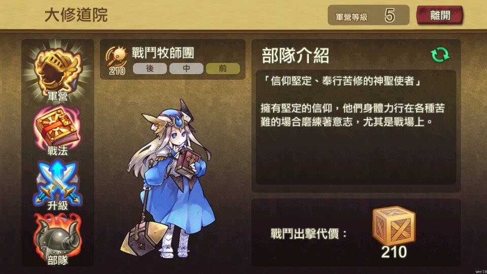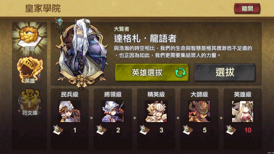 王國騎士團》的玩家,都不會忘記龍老推人入坑的邪惡嘴臉!指揮官確實是戰力的強大支柱,手機版在 15 級就提前開放了皇家學院讓玩家抽選指揮官,而且只能以第一武士推薦函或商城寶石來抽選。乍看之下覺得這坑也太大!不過任務給予的首抽獎勵是最高階的 AS/SS 指揮官,且寶石抽選必得桂冠,對於無課玩家來說,只要使用遊戲中各管道取得的寶石,就足以撐起基本戰力。