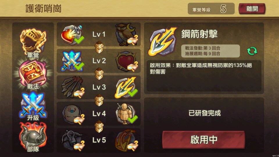 重點是無論是軍營或城塞都不要升級過頭,一來資源消耗大、二來高等級部隊的出擊代價也高,會很傷物資;也不用所有的軍營都建造,挑選已有適合英雄的軍營比較重要。資源要花在刀口上,不小心把資源都耗盡可就暫時不能出戰了。