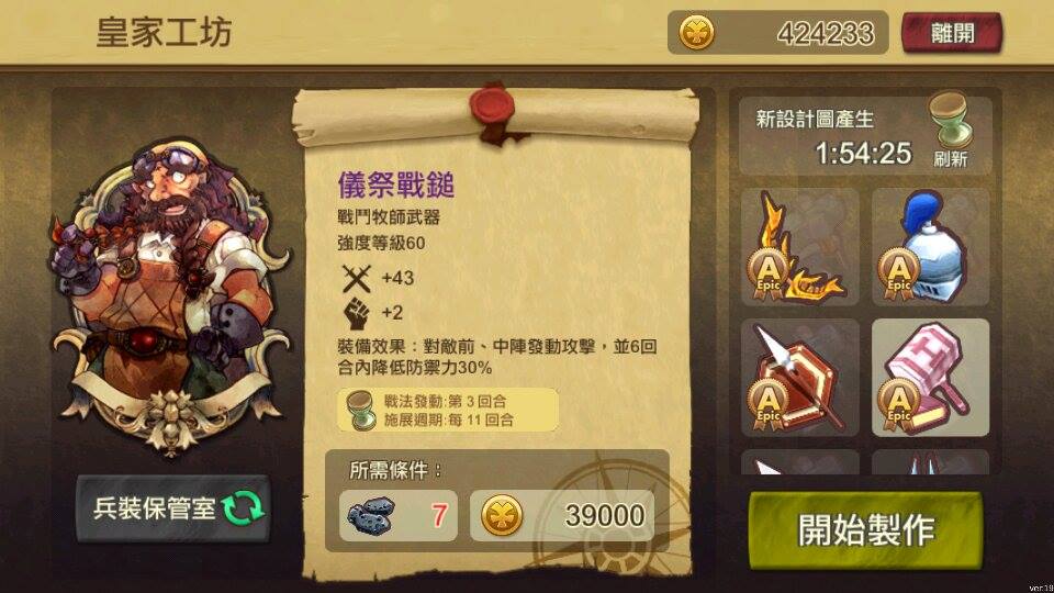 皇家工坊建議要三不五時光顧一下,但是購買裝備的時候記得要湊成套,畢竟頭盔和甲冑的戰法若要發揮作用,武器是不能少的,千萬先選好武器之後再考慮製作其它部位。