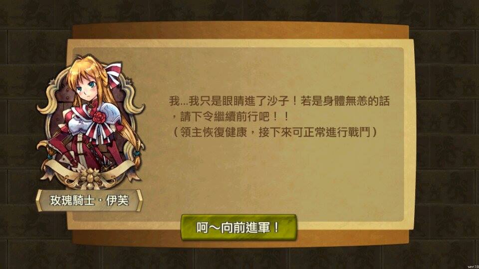 王國騎士團》的遊戲進度,設定也改動許多,基本上這已經是兩款完全不同的遊戲。雖然對網頁版仍有感情,但在戰鬥體驗上,手機版確實是刺激許多。這或許和戰鬥順序改變有關連(網頁版是我方全體打完換敵方攻擊,手機版則是我方前陣打完換敵方前陣…如此交錯攻擊),而且指揮官在戰役中也可以獲得經驗值,不像網頁版必須丟到冒險者公會去孤獨地冒險才能成長。