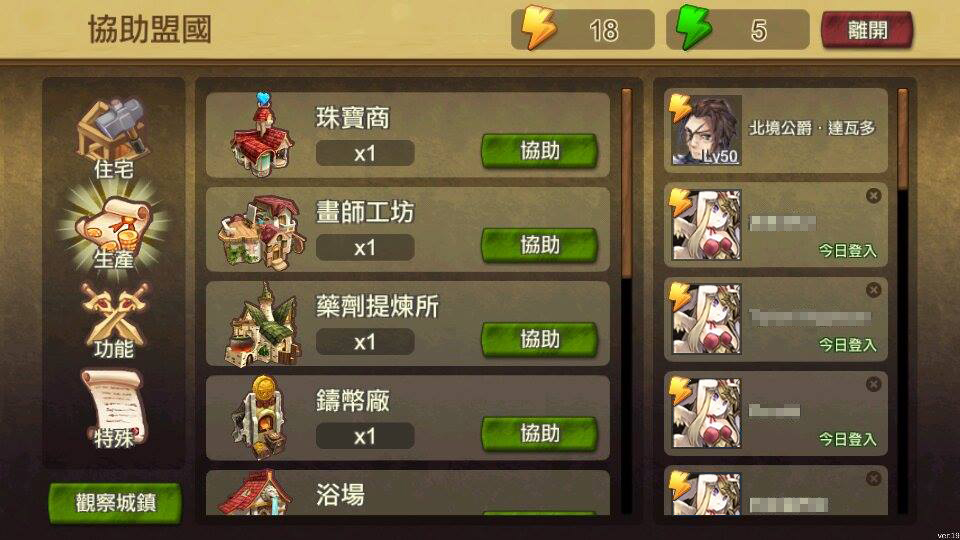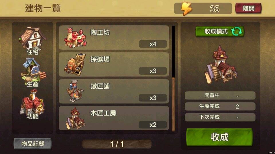 筆者剛開始進行遊戲時,沒發現「建物」介面的奧妙之處,曾有想要進行生產的建物被好友的協助頭像擋住、因此點不到建物的麻煩經驗。「建物」介面內列出了玩家自己領土上的所有建物,無論生產或採收都可以在這裡完成。