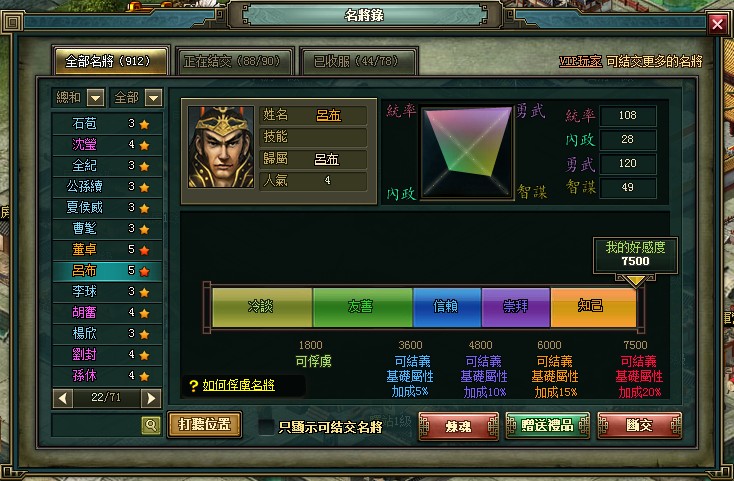 每一個好感物品可增加 10 個知己值,如上圖呂布原先的崇拜基礎為 6000,若要達到結交知己,需要到 7500 的好感度,那麼還需要 150 個好感物品才能達結交到知己滿值。