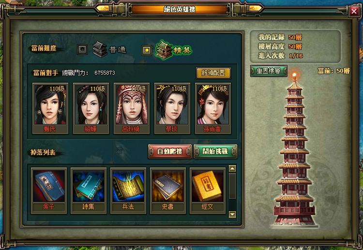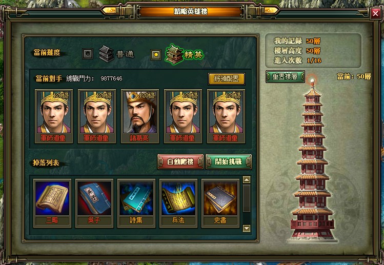 至於「韜略英雄樓」則是雲集了各路知名的智將,和諸葛亮、曹沖以及司馬懿挑戰謀略和智識!兩座英雄樓均為 50 層,分成普通以及精英模式,玩家完成英雄樓後,除了好感度物品(包括全新登場的紅色品質好感度物品:吳子、司馬法、六道、三略)外,還會掉落稀有的晶魄和器靈。