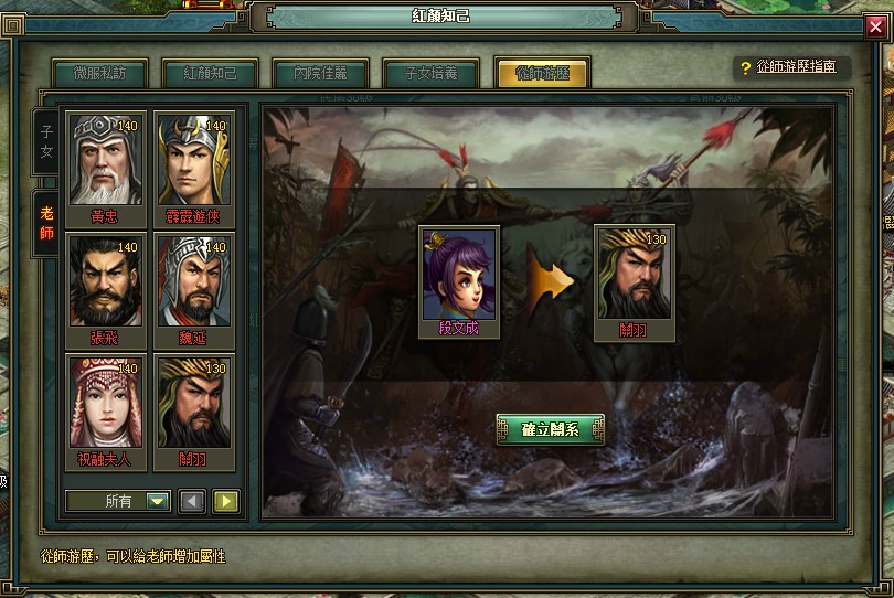 熱血三國 2》推出「煮酒論英雄」版本內,特別增加:「從師遊歷」功能。只要是未出師的子女,玩家即可安排手下的武將做為孩子的老師進行遊歷玩法。完成之後師傅將領可增加屬性:勇武、智謀、統率、內政都可通過遊歷得到提升。另外,名師出高徒,孩子與師傅的屬性越好,得到的提升也會更多。