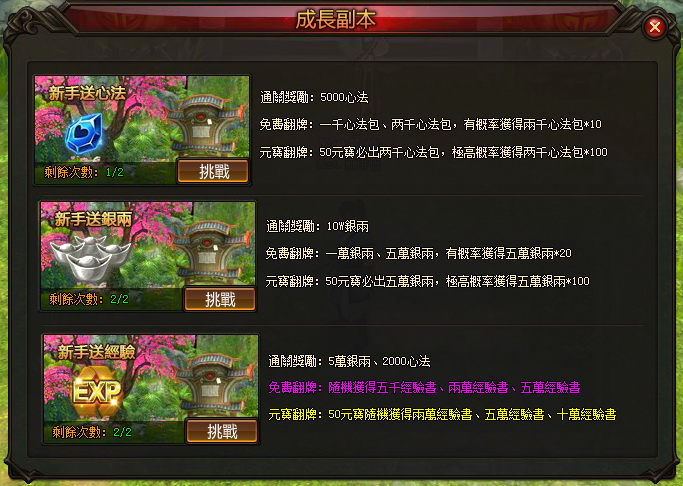 「成長副本」是本次公測推出的重點項目之一,玩家進入全新伺服器的前 3 天,系統將限時推出成長副本,當玩家等級超過 26 級後,即可前往挑戰。副本分為:新手送心法、新手送銀兩、新手送經驗等三大類,每個副本每天可供挑戰 2 次,透過副本及免費翻牌的機制,玩家可獲得大量獎勵幫助角色快速成長,而使用元寶翻牌更有極高機率獲得海量資源。