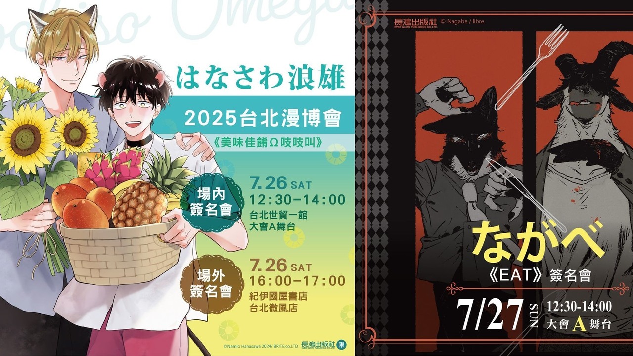 2025 台北漫畫博覽會,長鴻出版社宣布將邀請日本 BL 漫畫家はなさわ浪雄、ながべ及台灣 BL 漫畫家大介舉行現場簽名會。はなさわ浪雄除了漫博會場的簽名會之外,還另外規劃了一場書店簽名會。三組簽名資格組於 6/9 至 6/15 在長鴻官網... 繼續閱讀