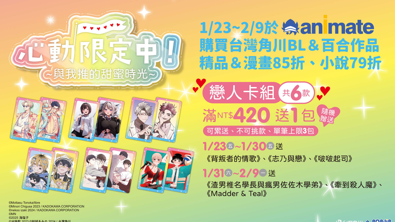台灣角川× animate POPUP SHOP & Gratte 聯名快閃活動即將自 1/23 展開,消費滿額特典與角色餐飲共享甜蜜時光。 台灣角川推出超人氣 BL & 百合向作品聯名企劃... 繼續閱讀
