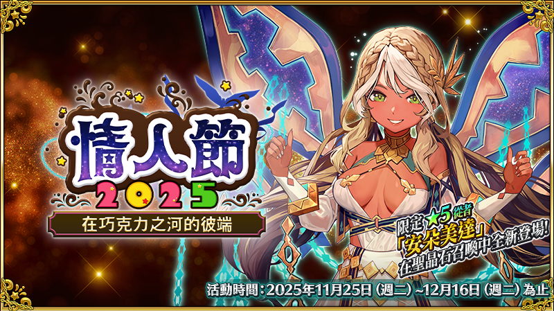《Fate/Grand Order》繁中版(中文名:命運 - 冠位指定,以下簡稱《FGO》繁中版)於今(25)日舉辦全新情人節活動「情人節 2025~在巧克力之河的彼端~」。靈子轉移後的御主一行人面對的,是散發著獨特甜美香味的巨大巧克力之河... 繼續閱讀