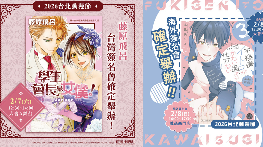 長鴻出版社於今日宣布,2026 台北國際動漫節將再次邀請到《學生會長是女僕!》漫畫家藤原飛呂來台舉辦簽名會活動,同時也預告超豪華台灣限定愛藏版內容即將揭曉。 《學生會長是女僕!》在 2010 年改編為電視動畫,故事以前... 繼續閱讀